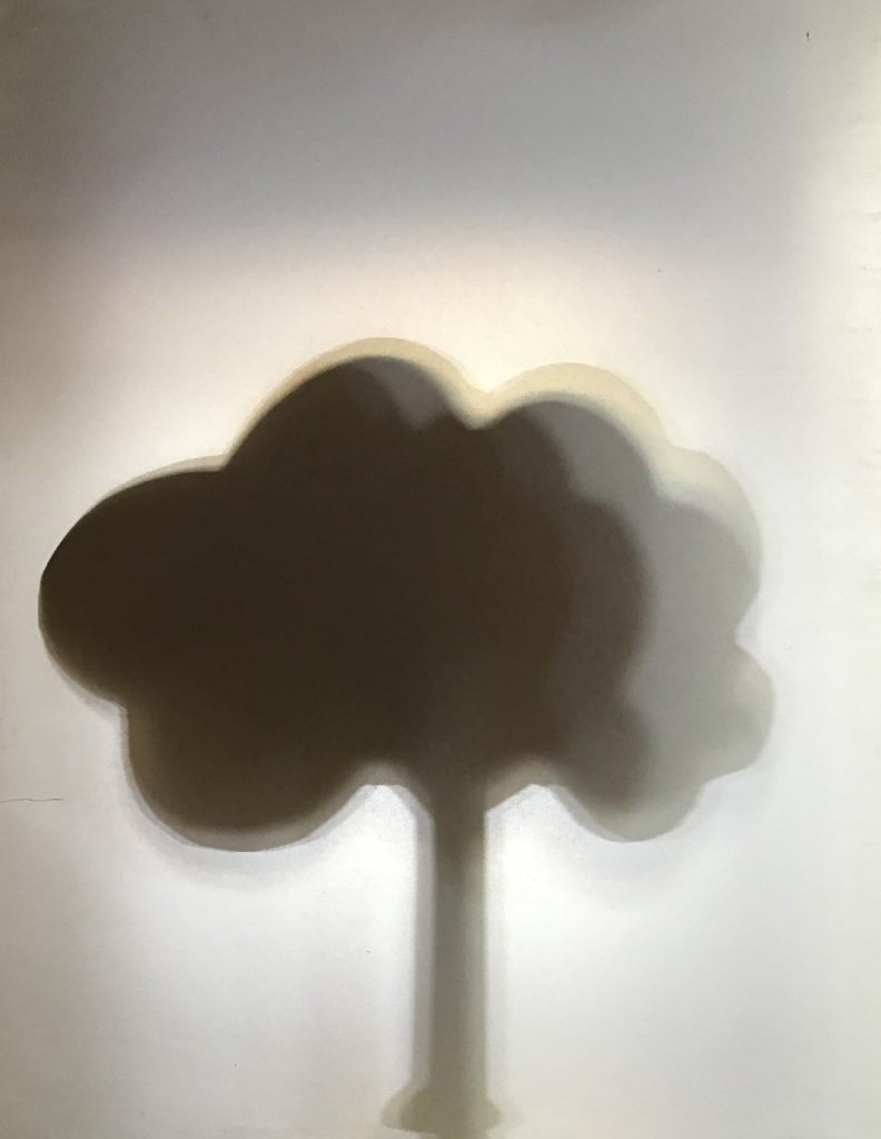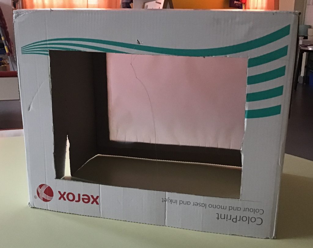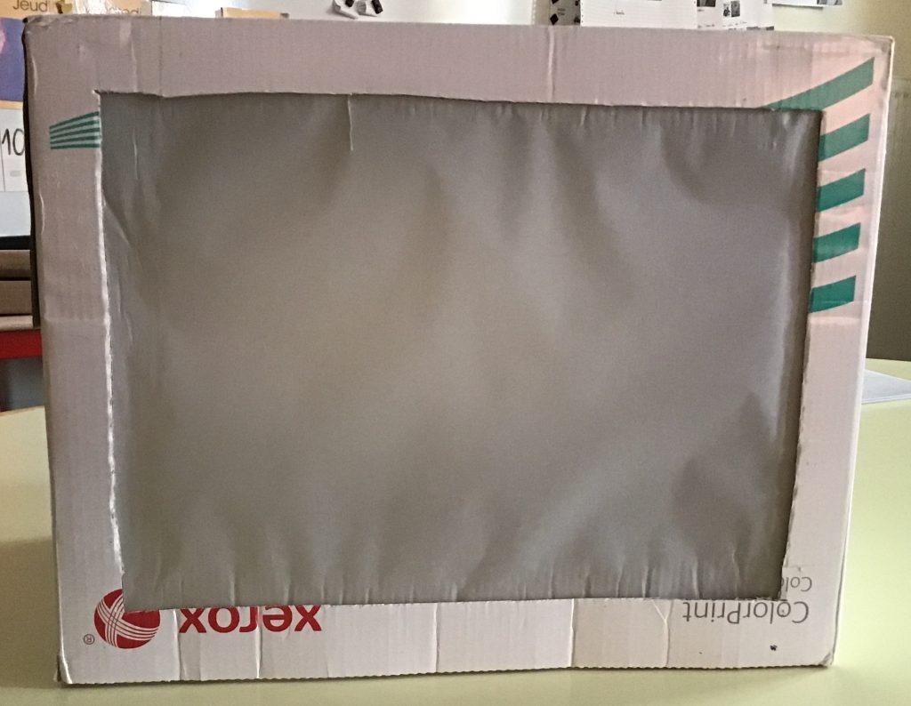 Nous avons mis des objets dans une grande boite en carton avec une fenêtre fermée par un papier calque. Nous avons éclairé les objets et nous avons photographié l’ombre de l’objet à travers le calque.