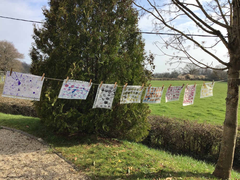 Tous les ans, notre classe participe à « la grande lessive » : c’est un projet en arts plastiques qui consiste à faire des réalisations sur un thème donné et à les accrocher dehors sur un fil avec des pinces à linge.