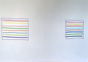 – lui demander de coller deux carrés sur une feuille de papier ; les carrés doivent être l’un en face de l’autre, et éloignés, un sur la partie gauche de la feuille et l’autre sur la partie droite. Pour que les carrés soient mieux visibles, vous pouvez les border de noir.